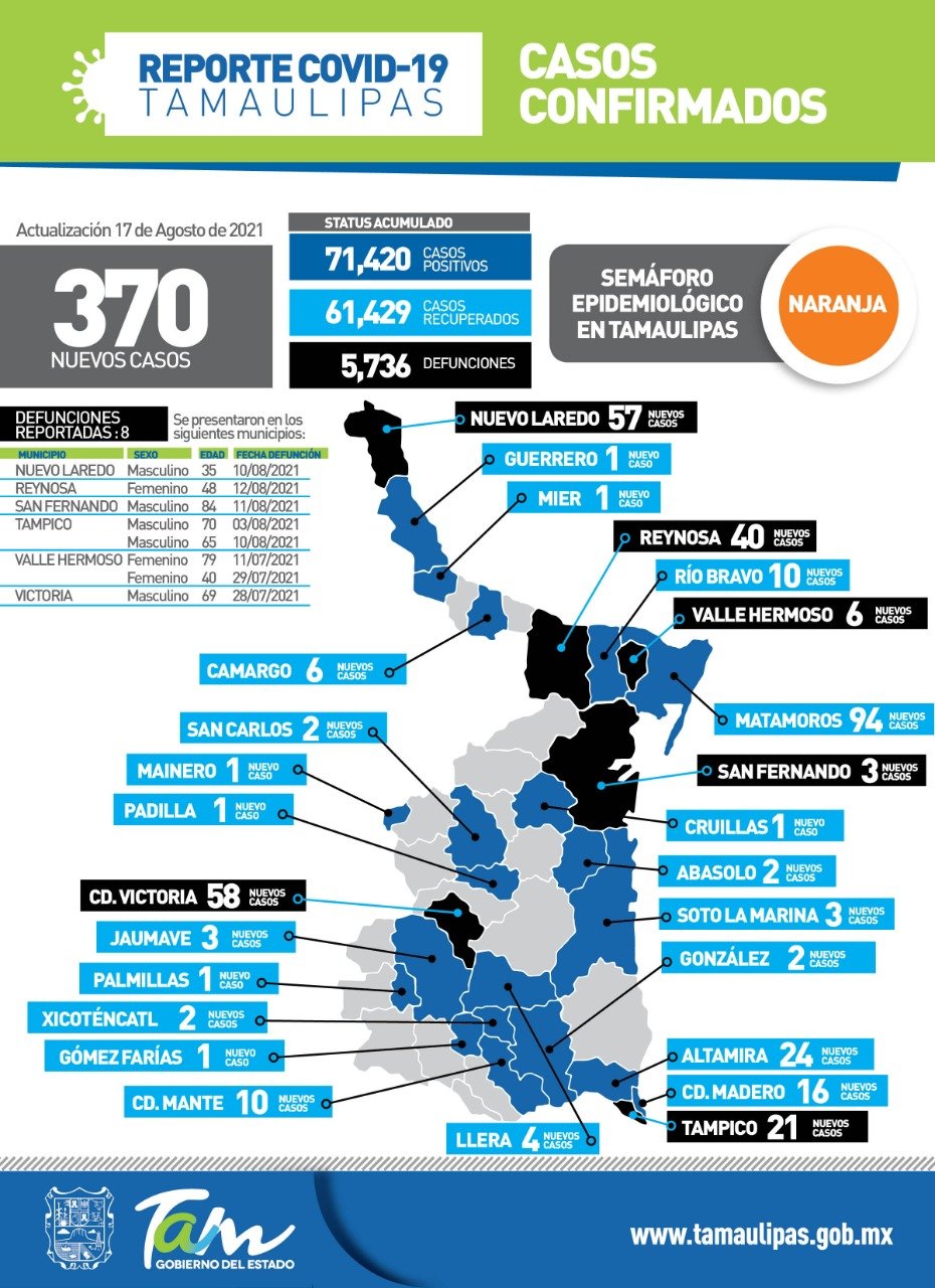 Respecto a la ocupación hospitalaria en Tamaulipas para este día se presenta de la siguiente manera: 48% en los hospitales de la Secretaria de Salud, 36% en el hospital Regional de Alta Especialidad, 64% en los hospitales del IMSS y 26% de ocupación en los hospitales del ISSSTE. Con una ocupación de todo el sector del 52%.