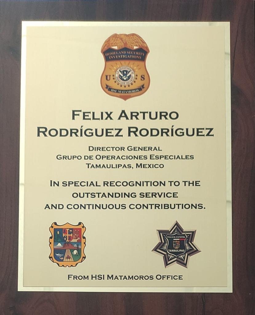 H. Matamoros, Tamaulipas. – Las Oficinas de la Administración para el Control de las Drogas (DEA, por sus siglas en inglés) y de Investigaciones en Seguridad Nacional (HSI), en el Consulado de Matamoros, otorgaron un reconocimiento al Director del Grupo de Operaciones Especiales (GOPES) de la Policía Estatal de Tamaulipas, Arturo Rodríguez Rodríguez.