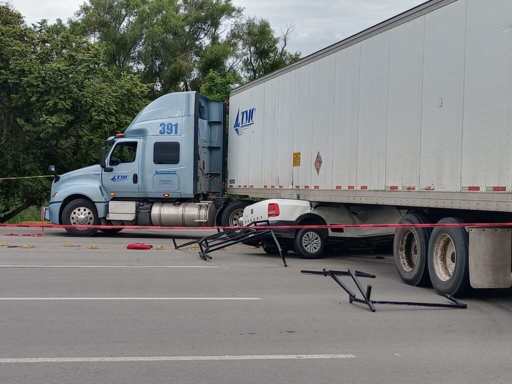 Una camioneta marca Volkswagen color blanca, terminó debajo de de un tráiler que transportaba 52 mil cápsulas de material excplosivo qué es utilizado para la destrucción de minas en Monclova Coahuila.