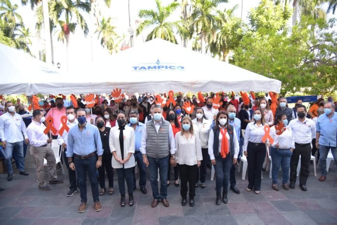 Tampico,Tam.- El Presidente municipal Chucho Nader y su esposa Aída Féres de Nader, Presidenta del Sistema DIF encabezaron este lunes la conmemoración del Mes de la Erradicación de la Violencia contra las Mujeres efectuado en la plaza de armas de Tampico.