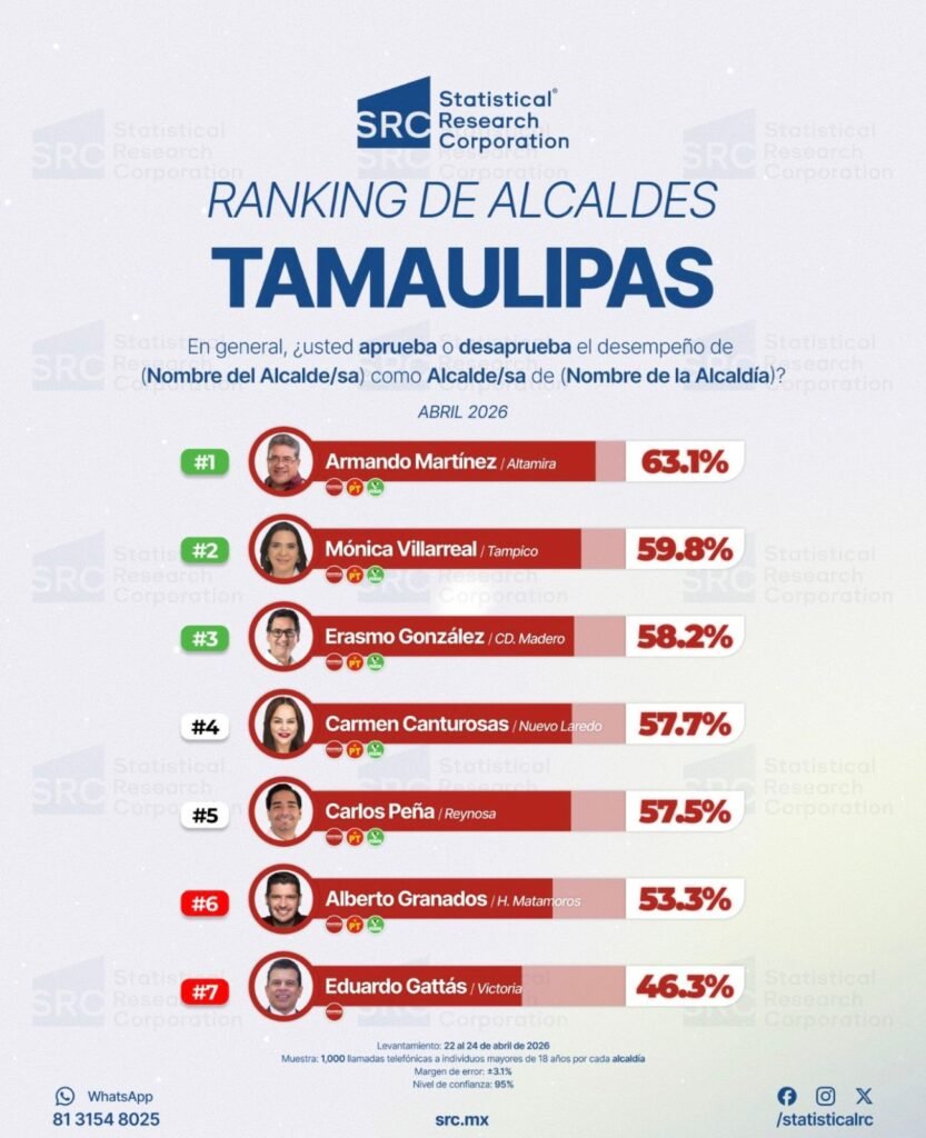 El alcalde de Altamira, Dr. Armando Martínez Manríquez, encabeza el ranking de aprobación ciudadana en Tamaulipas correspondiente al mes de abril de 2026, de acuerdo con la casa encuestadora Statistical Research Corporation (SRC), al alcanzar un 63.1 por ciento de respaldo.