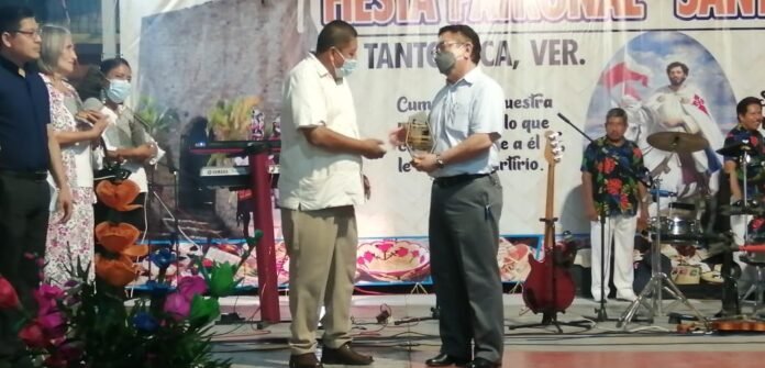 Tantoyuca, Ver.- Por el apoyo que brindó el H. Ayuntamiento en la organización de los diferentes eventos de la fiesta patronal dedicada a Santiago Apóstol que se realizó del 16 al 25 de julio, integrantes del comité, entregaron un reconocimiento al presidente municipal ingeniero Jesús Guzmán Avilés.