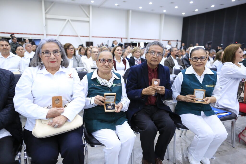 Por 55 años, se reconoció a Oscar Javier Álvarez Meléndez, médico especialista «C» del Hospital Civil de Victoria y a Alma Rosa Escobar Camacho, licenciada en Enfermería de la Oficina Central en Victoria, mientras que por 50 años recibieron su presea: Olga Castillo González, enfermera general titulada “A”; Distrito de Salud para el Bienestar VI en El Mante y Rubén Rodríguez Prado, jefe de sector en Programas de Salud en la Oficina Central de Victoria.