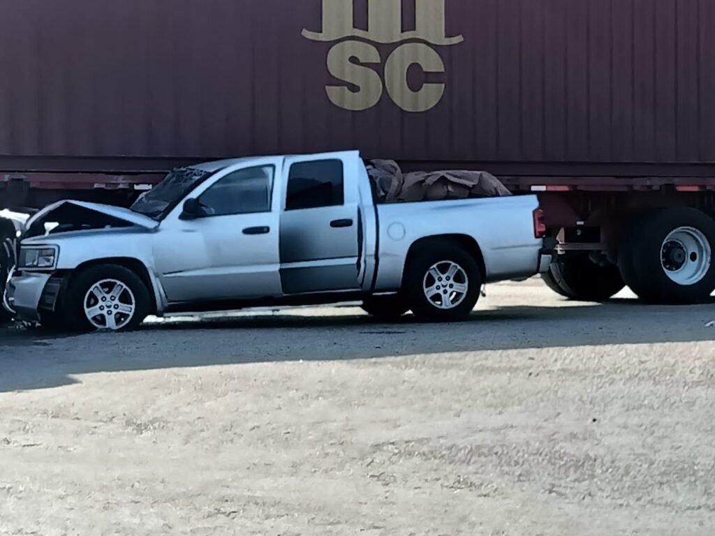 El conductor del tráiler doble remolque de la empresa LN15 Fletera Nacional con número económico 205, terminó atravesado y provocando que una camioneta Dakota color gris se impactará, quedando casi abajo de la unidad.