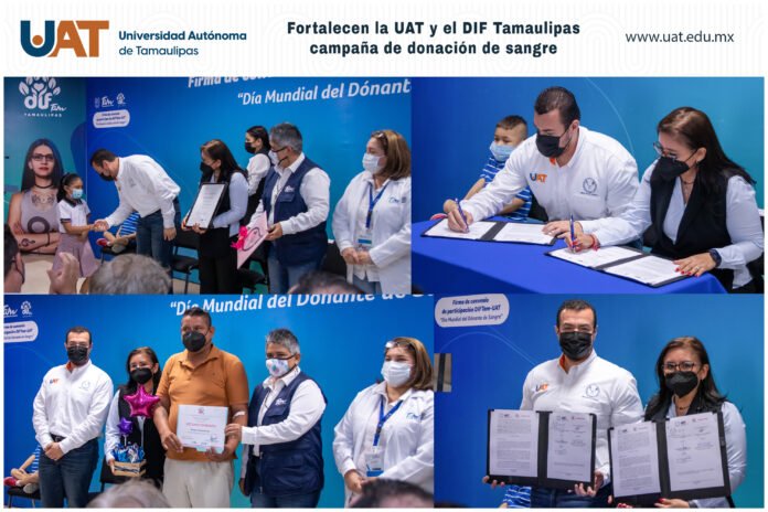 Con el propósito de fomentar en la comunidad universitaria la práctica generosa y voluntaria de la donación de sangre, la Universidad Autónoma de Tamaulipas (UAT) firmó el convenio de colaboración “Donar vida está en mi” con el Sistema DIF Tamaulipas que preside Mariana Gómez de García Cabeza de Vaca.