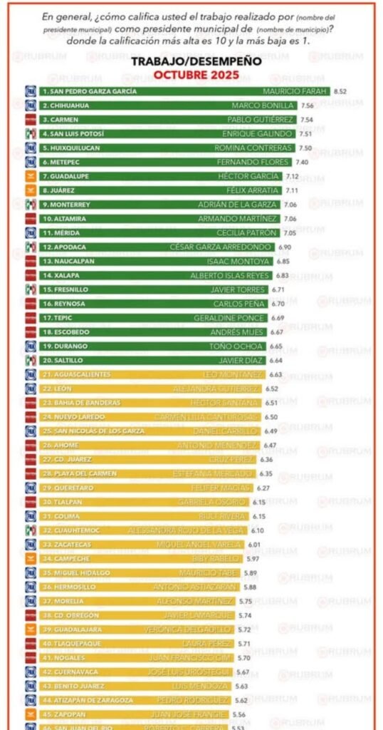 El estudio, realizado por la firma especializada en análisis de opinión pública, colocó al alcalde altamirense como el mejor calificado en Tamaulipas y entre los diez primeros lugares a nivel nacional en rubros clave como desempeño general, calidad de los servicios públicos, cercanía con la ciudadanía y percepción de seguridad.