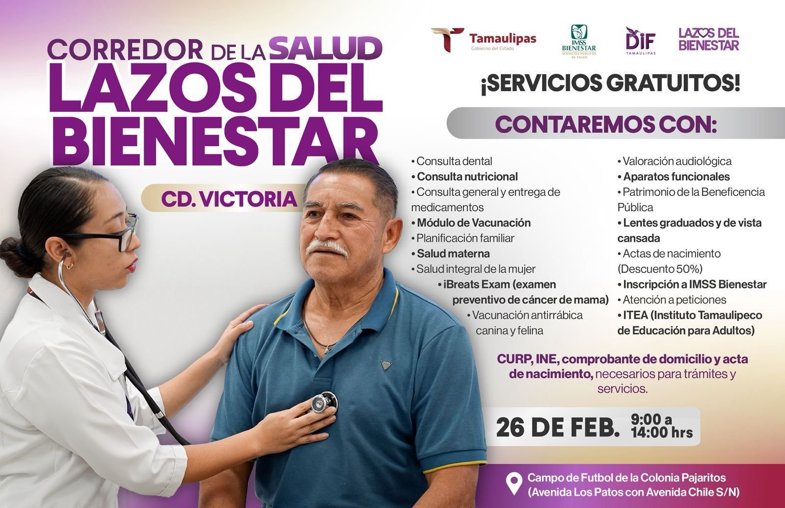 Ciudad Victoria, Tamaulipas, a 25 de febrero del 2026.- El Gobierno del Estado y el Sistema DIF Tamaulipas, presidido por la doctora María de Villarreal, invitan a las familias victorenses al Segundo Corredor de la Salud “Lazos del Bienestar”, que se llevará a cabo el jueves 26 de febrero, a partir de las 9:00 de la mañana, en el campo de fútbol de la colonia Pajaritos, ubicado en la avenida Los Patos con avenida Chile, en el oriente de la capital.