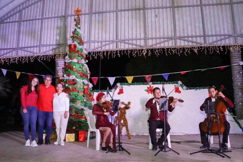 Altamira, Tam.- Un extraordinario programa cultural enmarcó el encendido del árbol de Navidad del ejido Esteros en Altamira, acto que fue encabezado por el presidente municipal, Mtro. Armando Martínez Manríquez y su esposa, la C.P. Rossy Luque de Martínez, presidenta del Sistema DIF local.