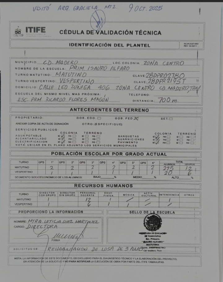 El pasado 9 de octubre, la arquitecta Graciela Martínez, enlace del ITIFE, acudió al plantel para realizar una evaluación técnica. Tras recorrer los salones y revisar los techos, determinó que no hay riesgo de colapso total, aunque reconoció la necesidad de reforzar con vigas de acero, retirar el entortado, impermeabilizar con materiales ligeros, reemplazar la instalación eléctrica y rehacer el enjarre de las aulas afectadas.