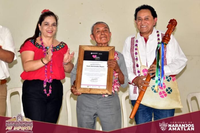 Naranjos, Ver. – La directora del Instituto Veracruzano de la Cultura (IVEC), Mtra. Silvia Alejandre Parado, junto con el alcalde, Mtro. José Luis Banda Cruz entregaron un reconocimiento como “Tesoro Vivo 2023” al Sr. Juan Hernández Reyes, mejor conocido como “Don Juanito”, por sus conocimientos y trayectoria musical que preserva la identidad cultural, como la lengua originaria Tenek y los sones tradicionales para las diversas danzas de la comunidad de Zaragoza, perteneciente al municipio de Naranjos-Amatlán y la región.