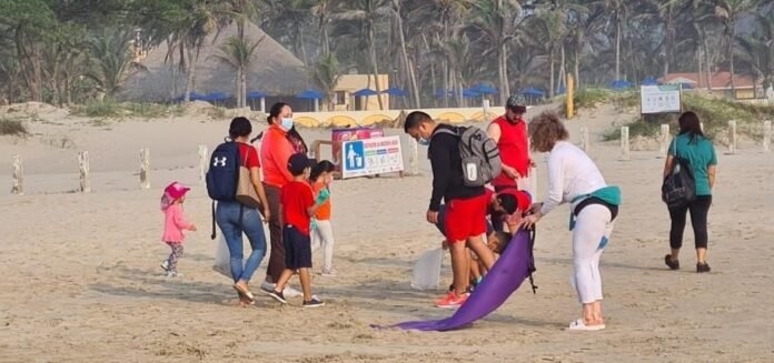 Los visitantes fueron recibidos en el acceso incluyente del área Blue Flag, siendo atendidos por personal de la Dirección de Turismo y por la botarga de la Tortuga Lora.
