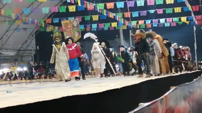 Tantoyuca, Ver.- Una majestuosa fiesta de Día de Muertos o Xantolo se vive en esta ciudad, en un escenario completamente iluminado y sentados para poder disfrutar a los Viejos Enmascarados de las diferentes cuadrillas.