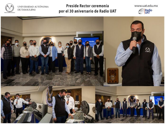 El C. P. Guillermo Mendoza Cavazos, Rector de la Universidad Autónoma de Tamaulipas, presidió el acto conmemorativo del trigésimo aniversario de la fundación de Radio UAT, ceremonia celebrada en el vestíbulo del edificio de la Rectoría, en esta capital.