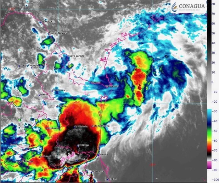 Durante esta noche y madrugada, un vórtice en niveles medios de la atmósfera en el noreste del país, en interacción con inestabilidad atmosférica superior, ocasionarán lluvias puntuales intensas acompañadas de descargas eléctricas y granizadas en Coahuila, Nuevo León, Tamaulipas y San Luis Potosí, así como rachas fuertes de viento con posible formación de torbellinos o tornados en Sonora, Nuevo León, Tamaulipas y San Luis Potosí.