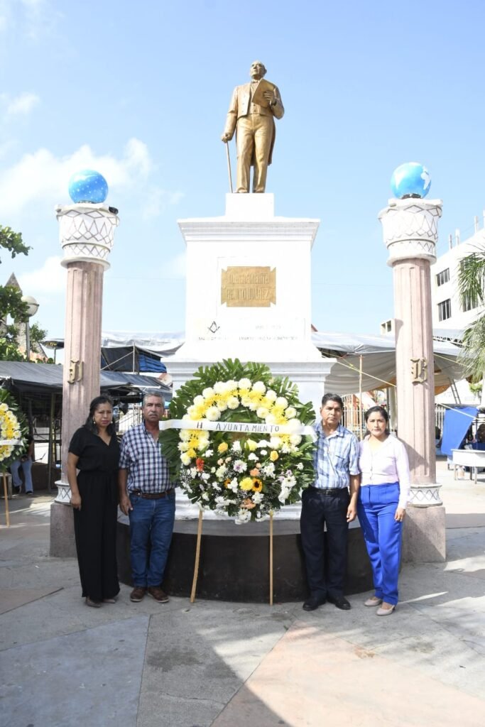 Tantoyuca, Ver.- El H. Ayuntamiento que encabeza el ingeniero Jesús Guzmán Avilés en coordinación con integrantes de la logia simbólica Salomón 80, recordaron a Benito Juárez, al colocar una ofrenda floral en el monumento dedicado al Benemérito de las Américas.
