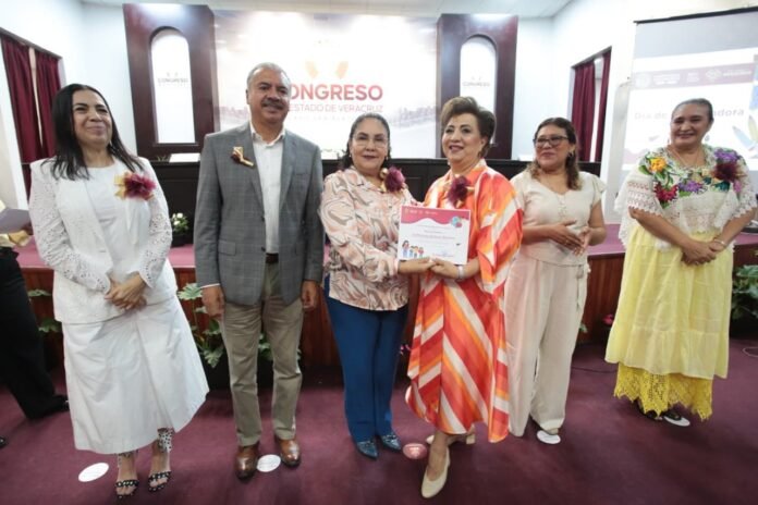 Durante un acto realizado en el auditorio Sebastián Lerdo de Tejada del Congreso del Estado, la titular de la SEV, Claudia Tello Espinosa, encabezó la entrega de reconocimientos a docentes por su trayectoria y méritos, acompañada por integrantes del Poder Legislativo.