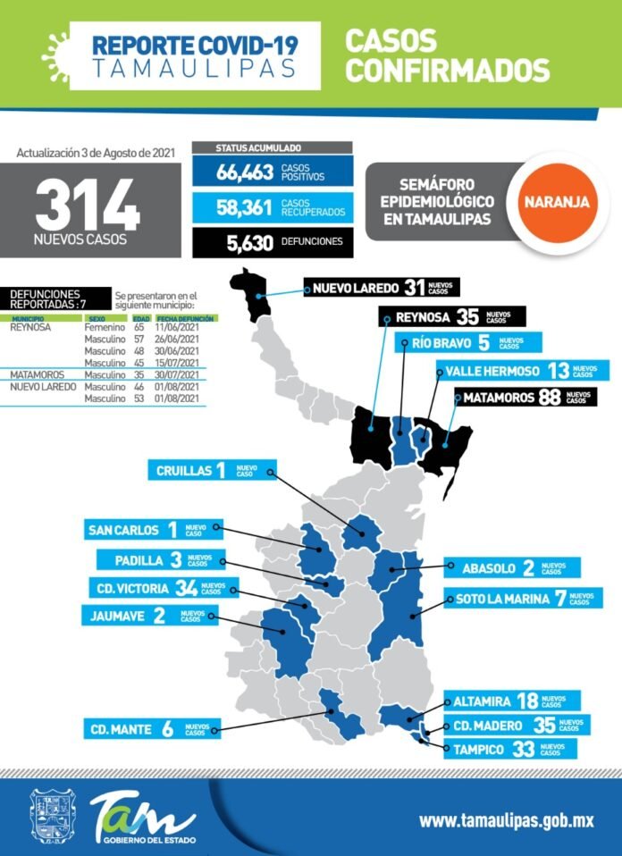 Ciudad Victoria, Tam., 3 de Agosto de 2021.- En su reporte COVID-19 de este martes, la secretaria de Salud de Tamaulipas, Gloria Molina Gamboa confirmó 314 nuevos casos y 7 fallecimientos asociados a complicaciones graves por la enfermedad, por lo que reiteró su llamado a la población a no bajar la guardia y atender en todo momento las seis medidas de seguridad sanitaria para desacelerar la transmisión del virus que son: Uso del cubrebocas, Mantener una distancia mínima de 2 metros con otras personas, Lavado correcto de manos y uso frecuente de alcohol gel, Hacerse la prueba, Aislamiento de casos positivos y Evitar asistir a reuniones sociales.