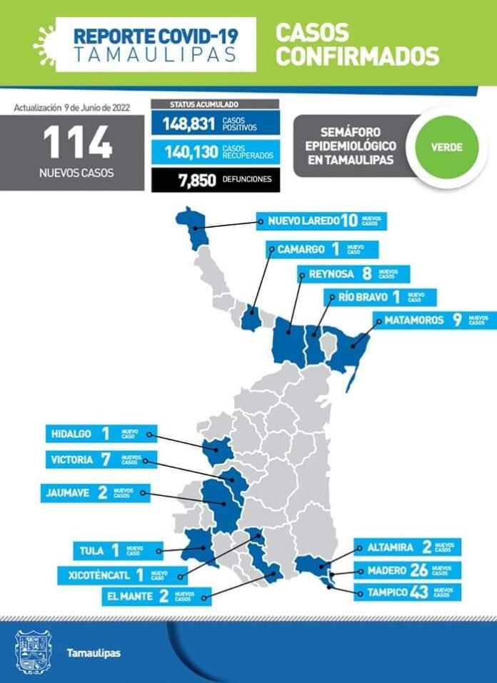 Ciudad Victoria, Tamaulipas.- Tamaulipas concluyó la jornada de este jueves sin fallecimientos por COVID-19, sin embargo, se confirmaron 114 nuevos casos, informó desde esta ciudad capital la secretaria de Salud, Gloria Molina Gamboa, quien insistió en su llamado a no bajar la guardia y evitar exponerse a un contagio.
