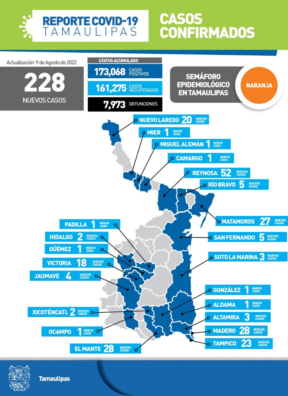 Ciudad Victoria, Tam.- Tamaulipas concluyó la jornada de este martes con 228 nuevos casos de COVID-19, informó en su reporte técnico diario la secretaria de Salud, Gloria Molina Gamboa, quien insistió en su llamado a no relajar las medidas de prevención para desacelerar la quinta ola de contagios.