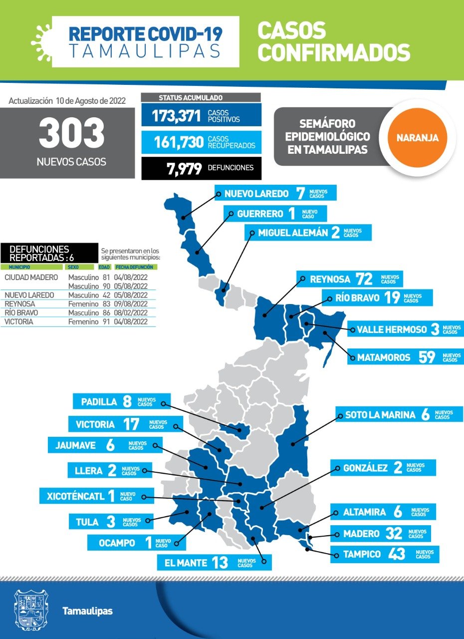 Tamaulipas con 303 nuevos casos de Covid