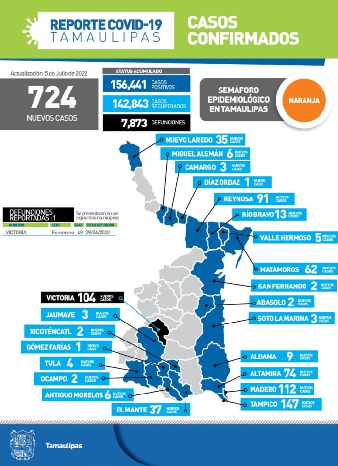 Ciudad Victoria, Tam.- La pandemia de COVID-19 sumó 724 nuevos casos y el fallecimiento de una mujer de 49 años de edad de Ciudad Victoria, informó en su reporte diario la secretaria de Salud, Gloria Molina Gamboa luego de advertir que la emergencia sanitaria no ha terminado y que el riesgo de contagio y de sufrir complicaciones graves sigue presente.
