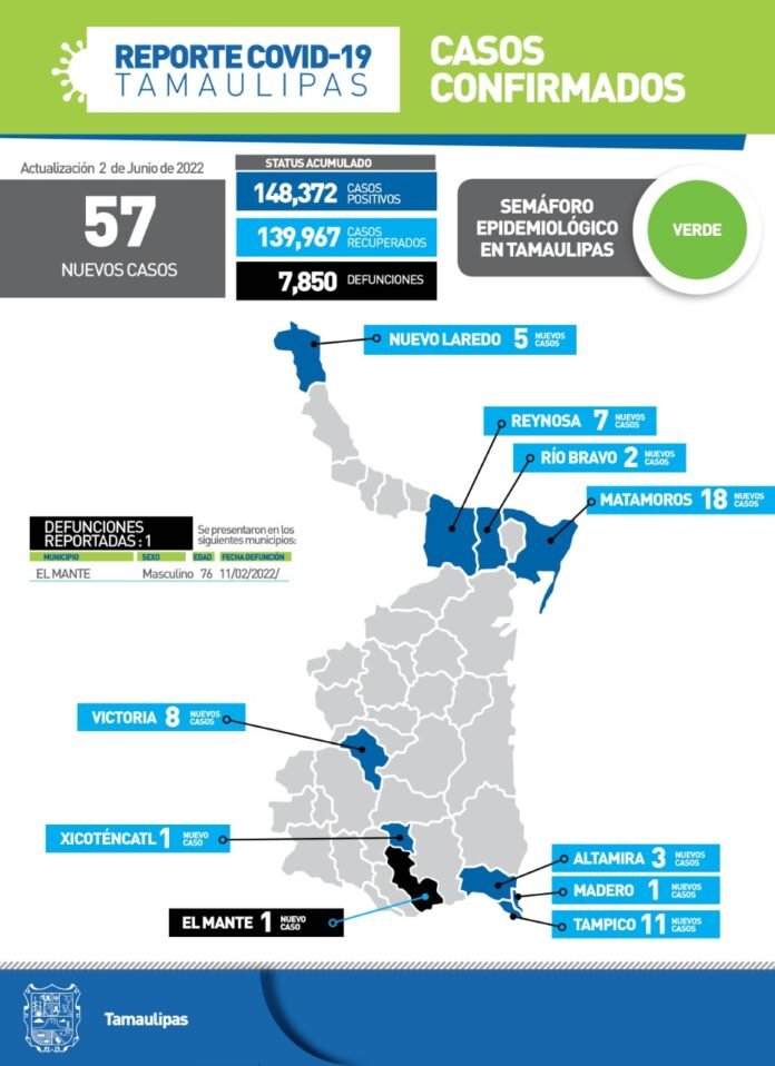 Ciudad Victoria, Tam.- La pandemia de COVID-19 sumó este jueves 57 nuevos casos y el fallecimiento de un adulto mayor en Tamaulipas, informó en su reporte técnico diario la Secretaría de Salud.