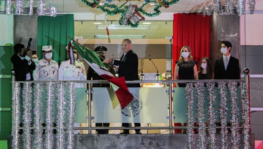 En su actuación, el Presidente Municipal recibió el símbolo patrio y acompañado por su familia y autoridades de la Guardia Nacional, la Secretaría de Marina y el Ejército Mexicano, se dirigió al balcón presidencial para proyectar en su grito, su incansable lucha por un Madero más próspero y un Tamaulipas lleno de esperanza.